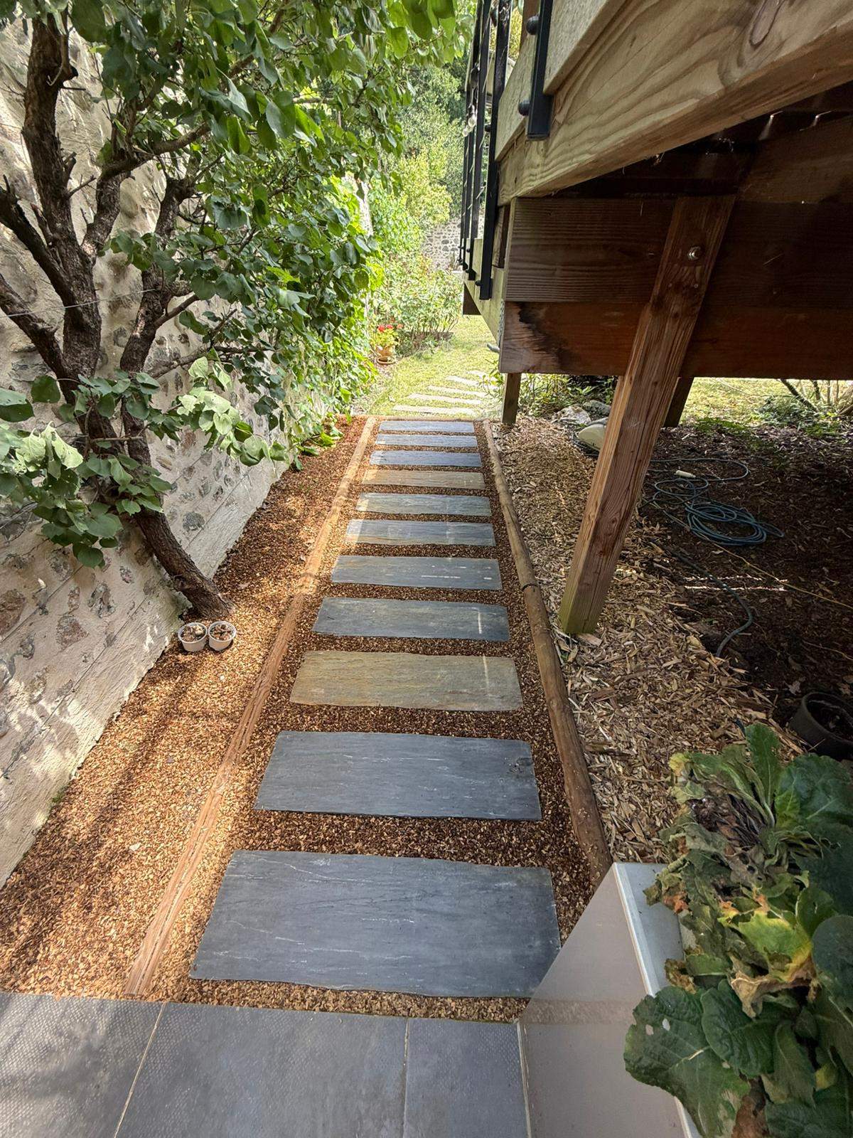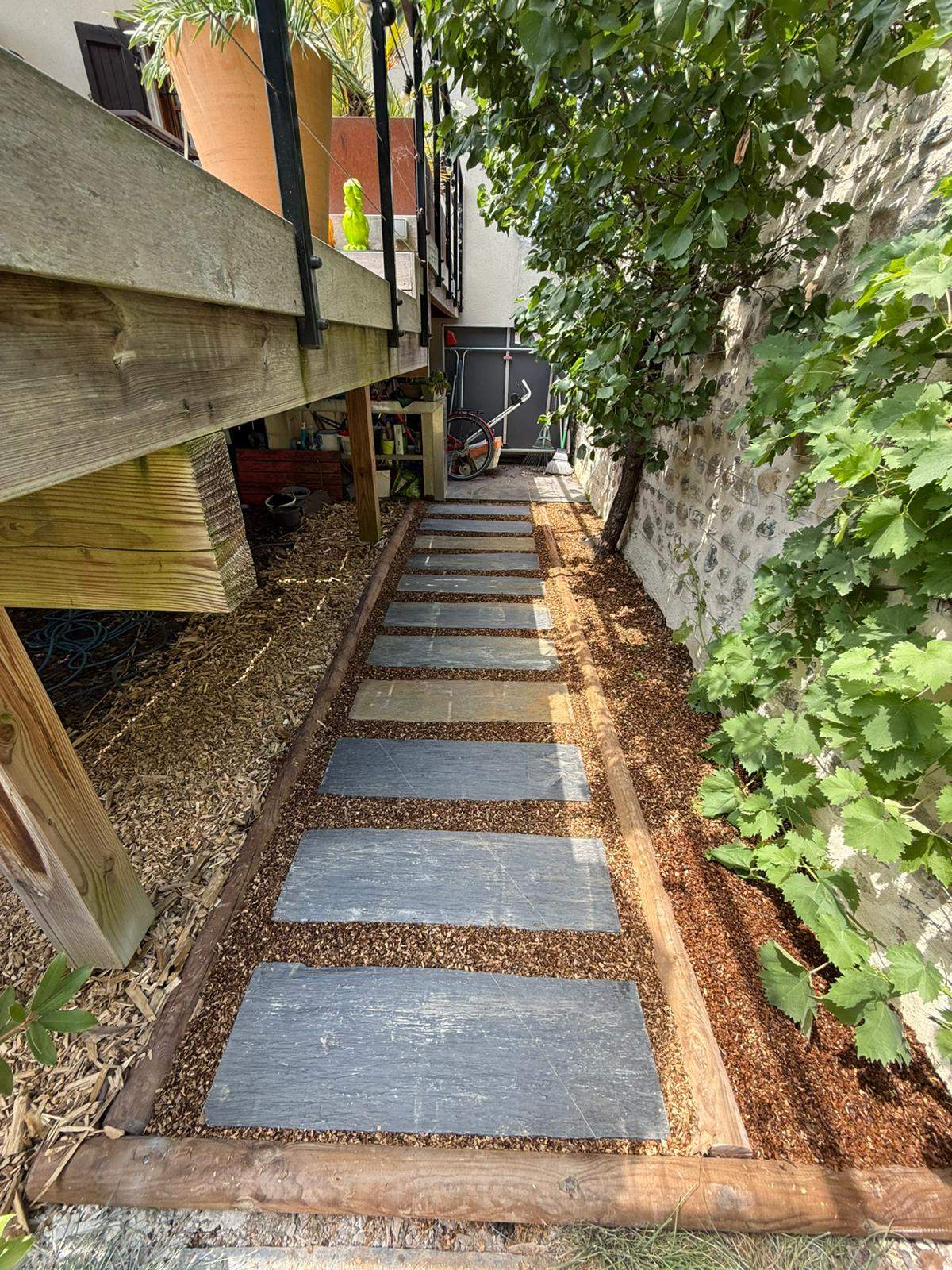 Réalisation d'un pas japonais en dalles de schiste. Pose de bordure bois et paillage en copeaux chêne.