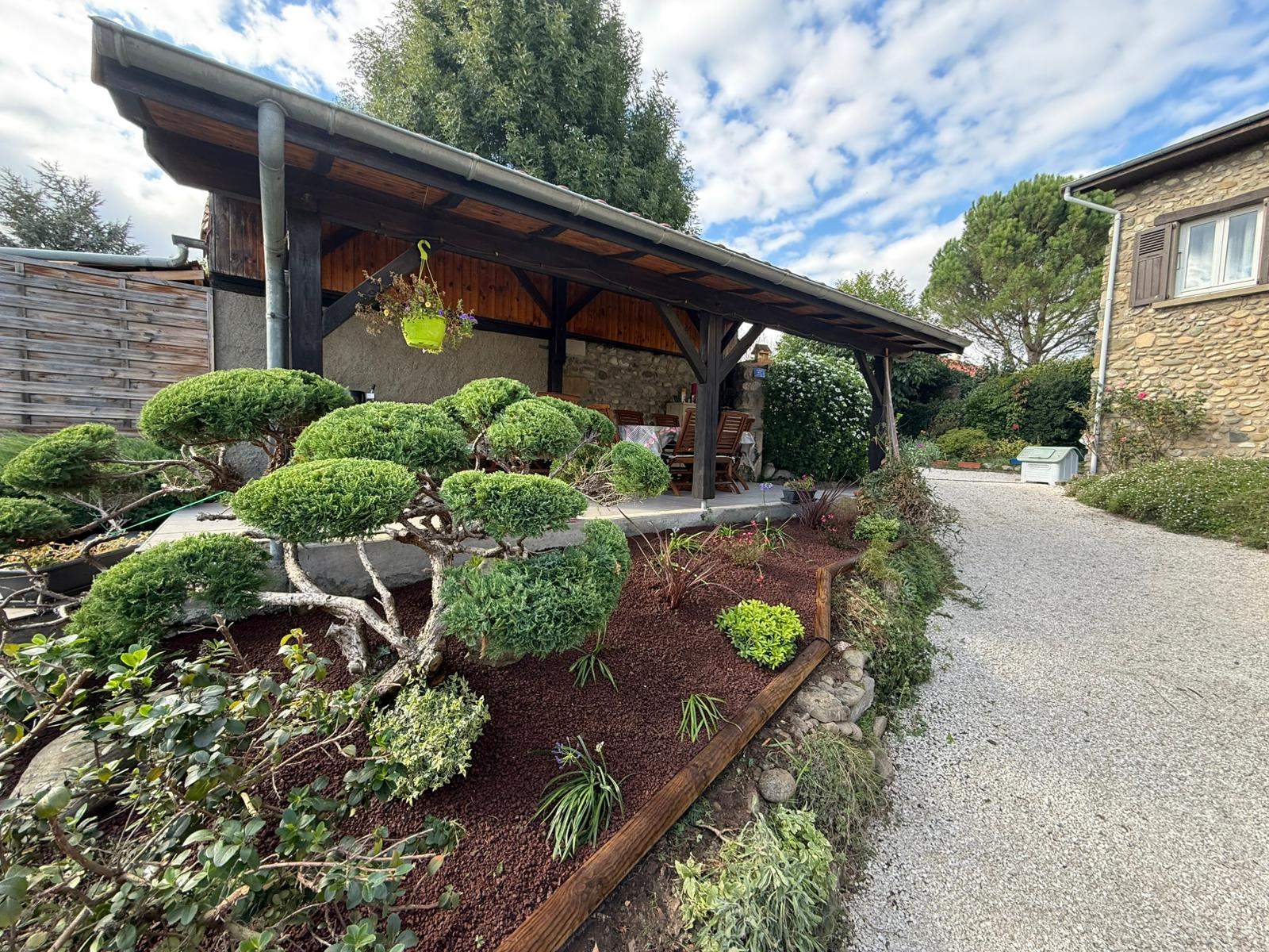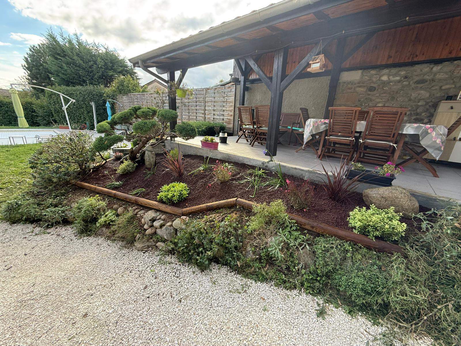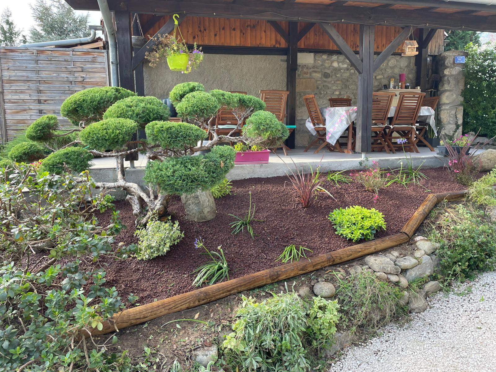 Reprise d'un massif existant. Arrachage de végétaux, pose de bordures bois, plantations de nouveaux végétaux et mise en valeur d'un Juniperus en taille nuages.