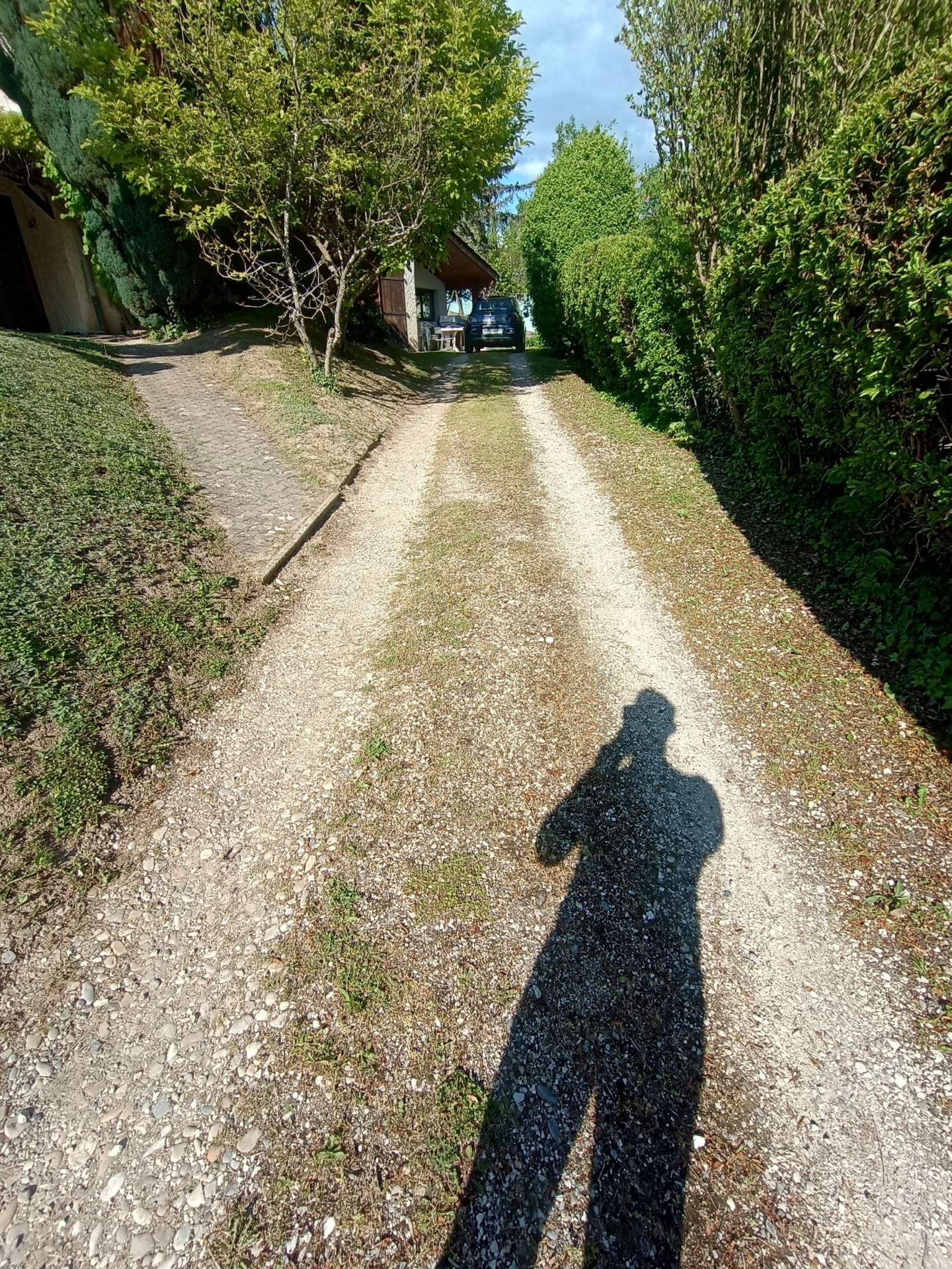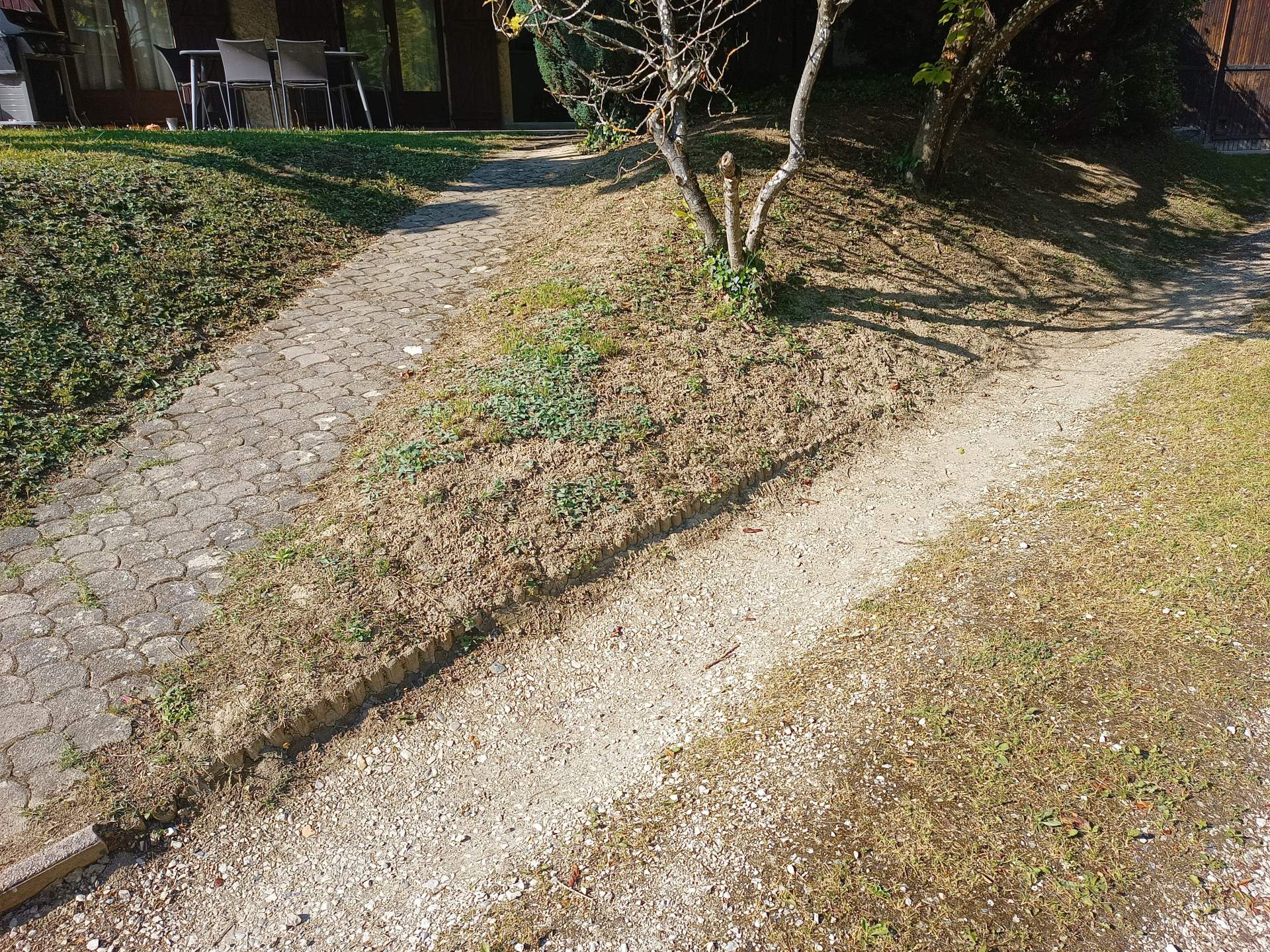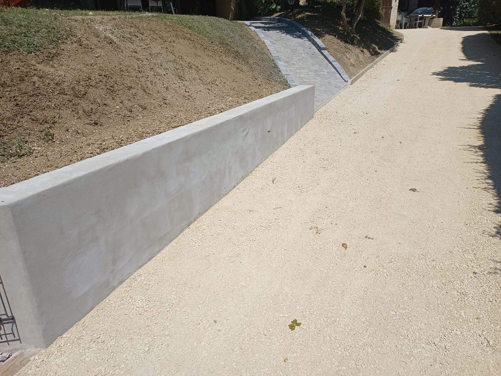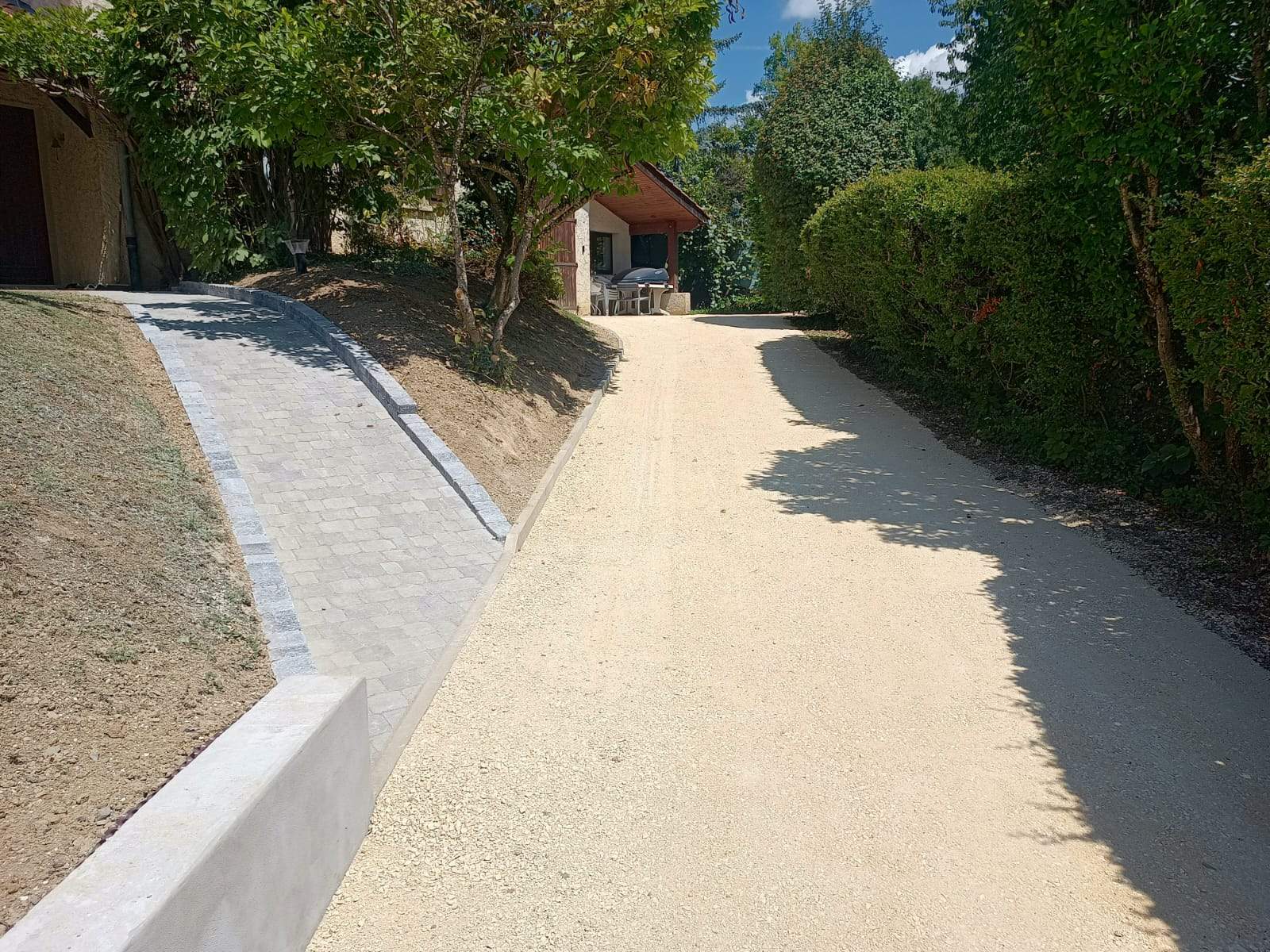 Reprise des allées d'accès à la maison. Pose de bordures béton et muret de soutènement. Reprise d'une cheminement en pavés et de l'allée en gravier.